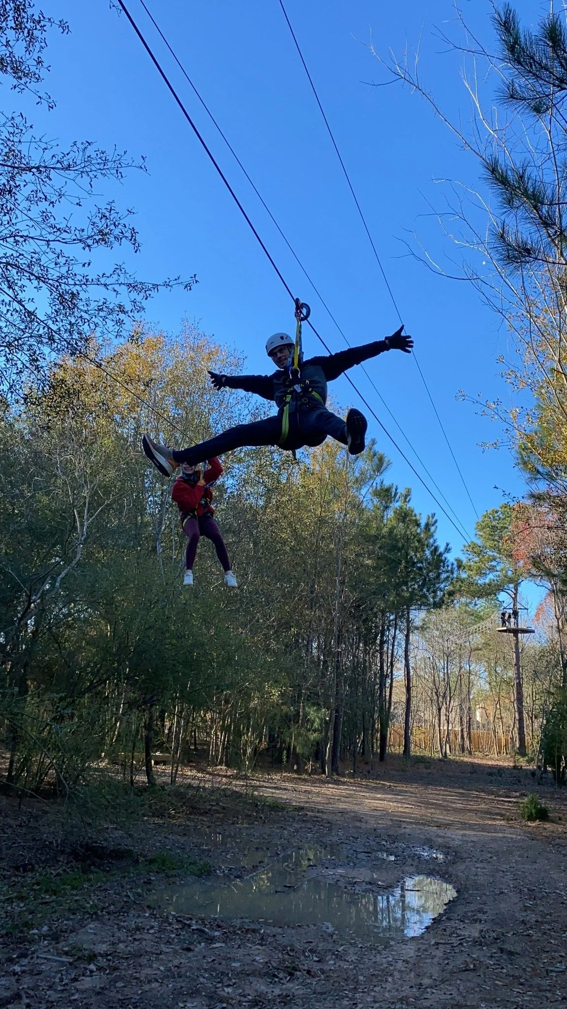 Guests are fully geared up and inspected by trained staff. After donning the harness and learning about your equipment, you will attend “Ground School” where you will learn how to use the equipment and practice using it at ground level before you go up in the trees! This entire process is supervised by our staff, and it’s a great time to ask any questions and let our guides help build your confidence for the upcoming adventure!