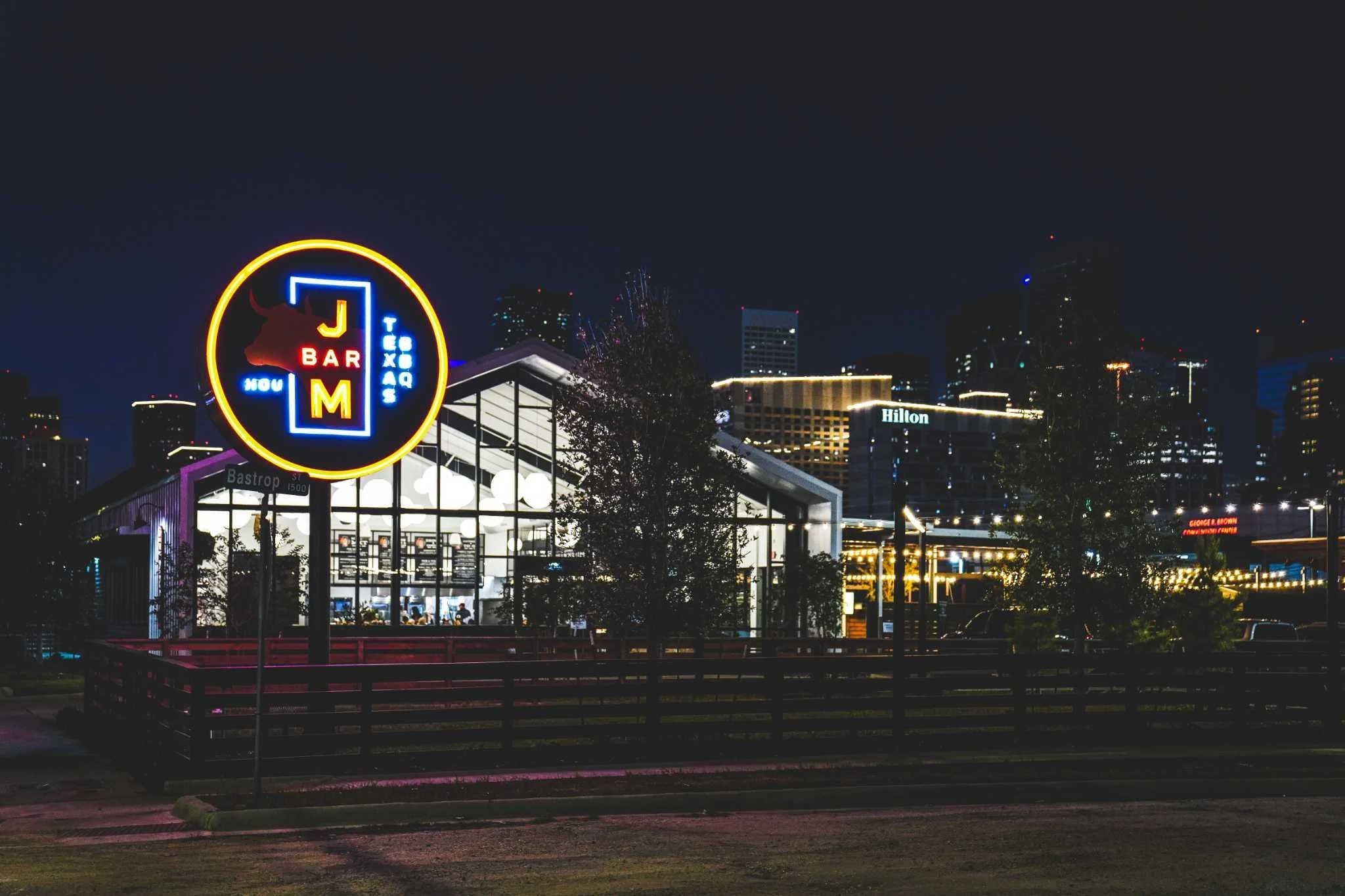 J-Bar-M is a destination restaurant for classic Texas smokehouse and barbecue favorites. Lead pit master Alec Varnell and team produce craft barbecue that combines Central Texas-style brisket with house-made sausage and traditional barbecue dishes like pork spareribs, turkey, smoked chicken, and pulled pork. Accompany your meal with your favorite craft cocktail, beer, or wine. Stay a while, enjoy the skyline view, free live music, and kid-friendly + dog-friendly outdoors
