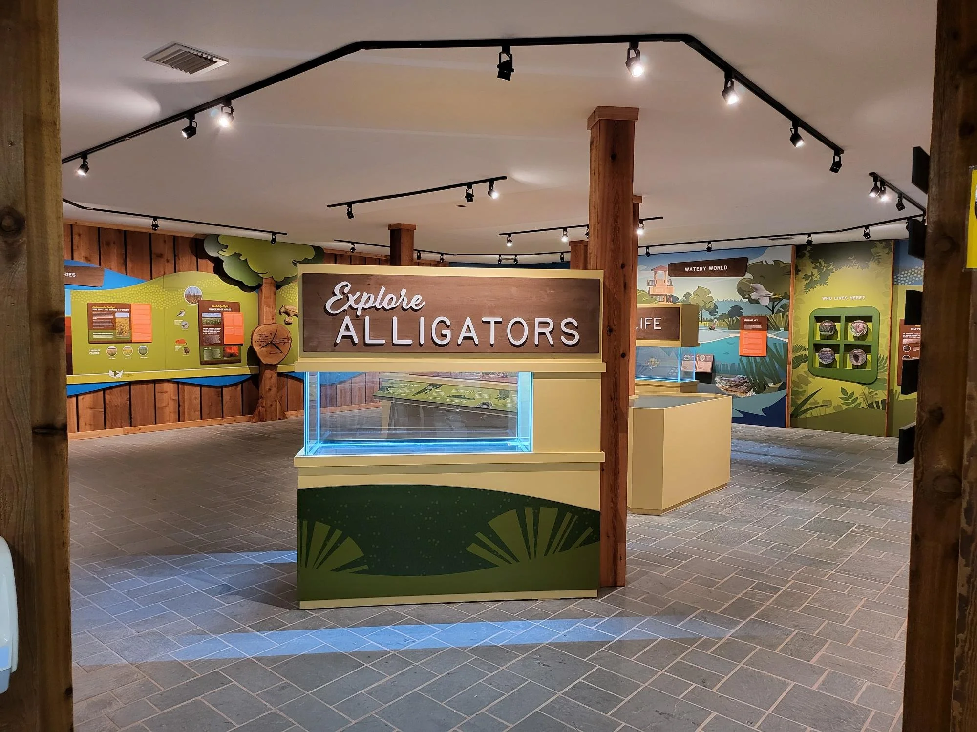 Designed and fabricated in partnership with HW Exhibits, this visitors center features a total remodel. Educational graphics and displays around the space give guests a lesson in the history and environmental importance of the area. Brazos Bend State Park is a 4,897-acre state park along the Brazos River near Houston, run by the Texas Parks and Wildlife Department. The park is a haven for a diverse mix of native wildlife and plants covering an equally diverse range of ecosystems.