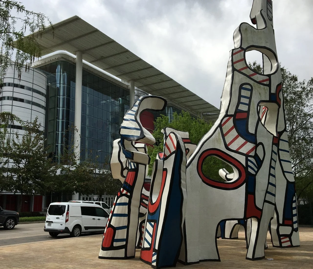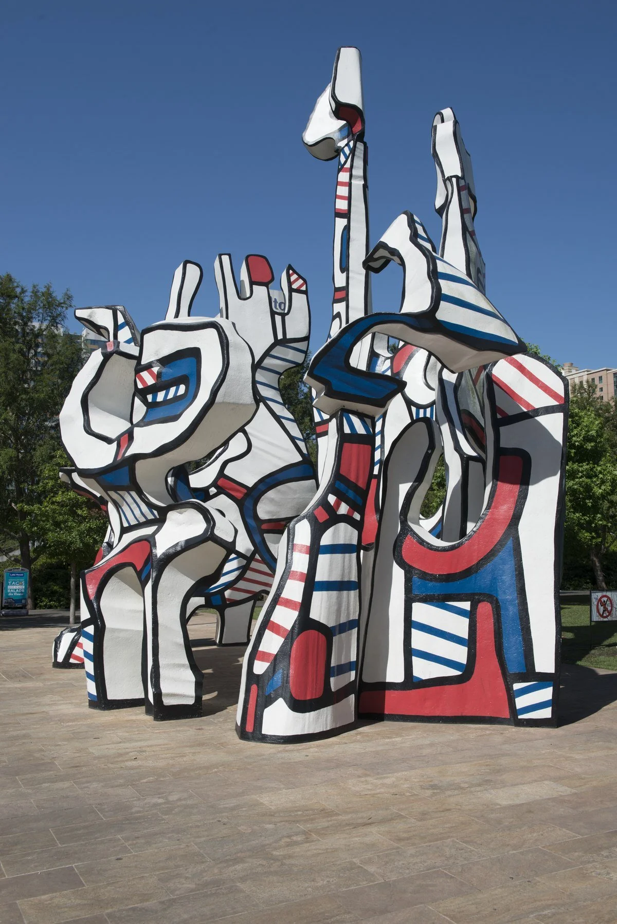 It is by Jean Dubuffet, an internationally-known 20th century French sculptor who passed away in 1985 (two years after the sculpture was completed). He liked to communicate fresh ideas without reference to “cultural clichés.” Dubuffet was inspired by the art of outsiders, which he called “L’Art Brut”. It is painted fiberglass over steel frames, and the tallest piece is 33 feet. The sculpture is part of his Hourloupe series, which has companion sculptures in New York, Chicago and Europe. For more than two decades, Jean Dubuffet’s sculpture, Monument au Fantôme, has sat among Houston’s downtown skyscrapers at 1100 Louisiana. In 2008 it was relocated to 1500 McKinney (Avenue de las Americas) in Discovery Green Park on the eastern edge of downtown. The tallest part of the fiberglass over steel frame stands 33 feet tall. Seven individual forms—chimney, church, dog, hedge, mast, phantom, and tree—included in the sculpture represent features of Houston.