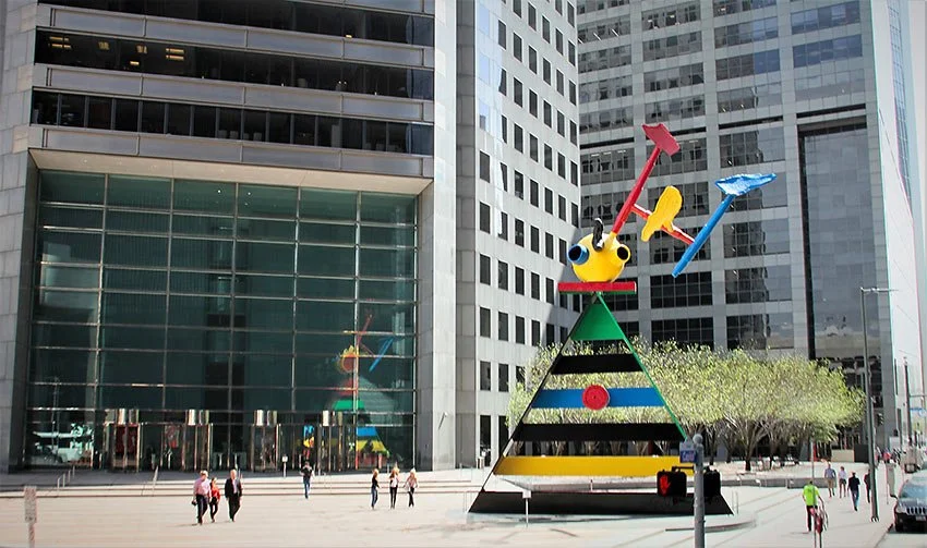 Joan Miró’s Personage and Birds dominates downtown Houston’s JPMorgan Chase Tower plaza like a colorful guard standing watch. The steel and cast-bronze sculpture is a representation of a person with birds in flight around the head. The body is a triangle made up of wide bands of metal painted in bright green, red, blue and yellow. A circle of red and yellow metal sits atop the “shoulders,” with three abstract shapes circling. The piece is the largest Miró ever commissioned (it is 35 feet wide at its base and stands 55 feet tall), but despite the colossal size, it seems lightweight, as if it could start walking across the plaza at any moment. The piece, chosen by the building’s architect, I.M. Pei, was installed to mark Miró’s 89th birthday in April of 1982