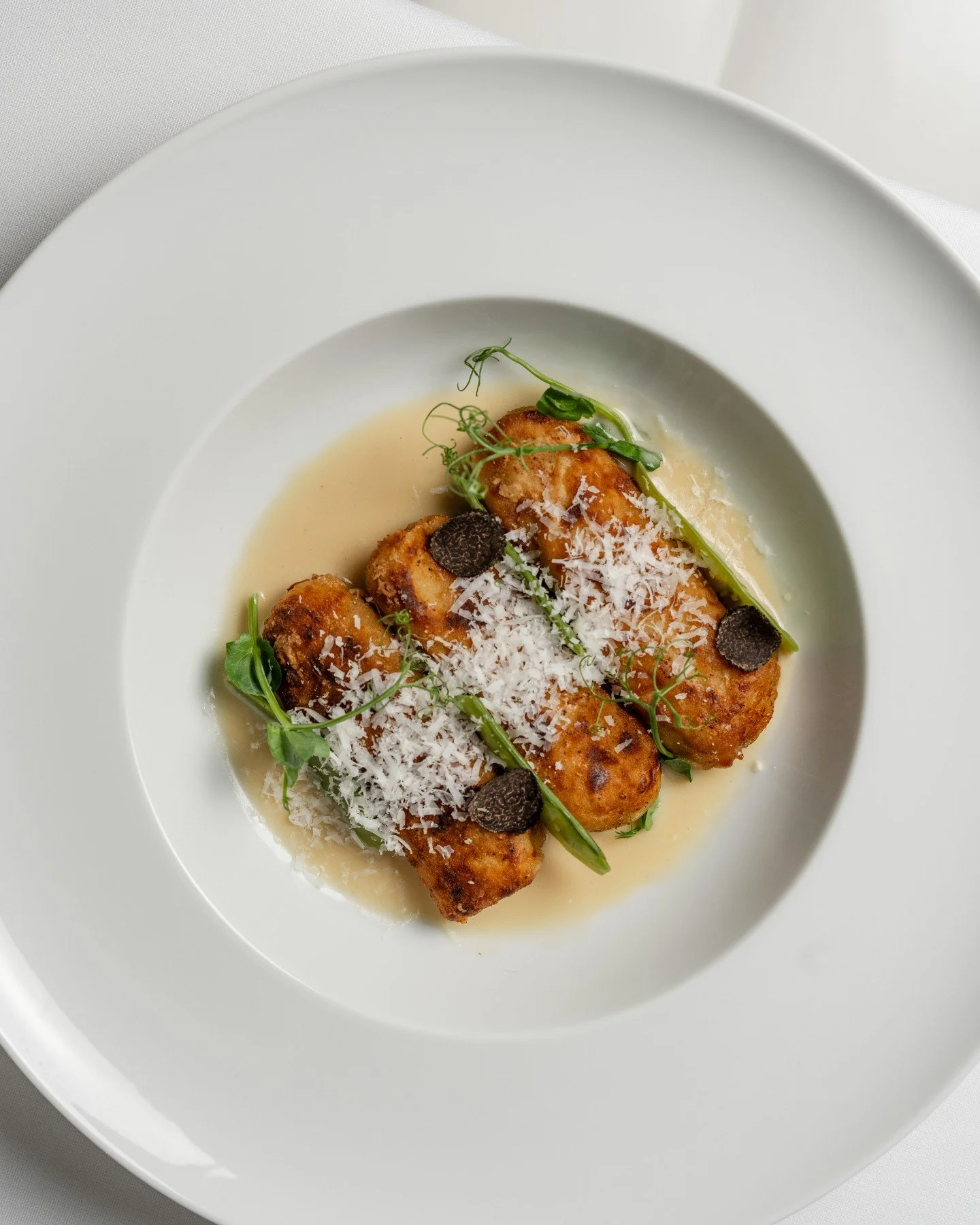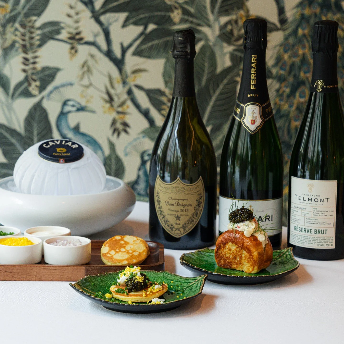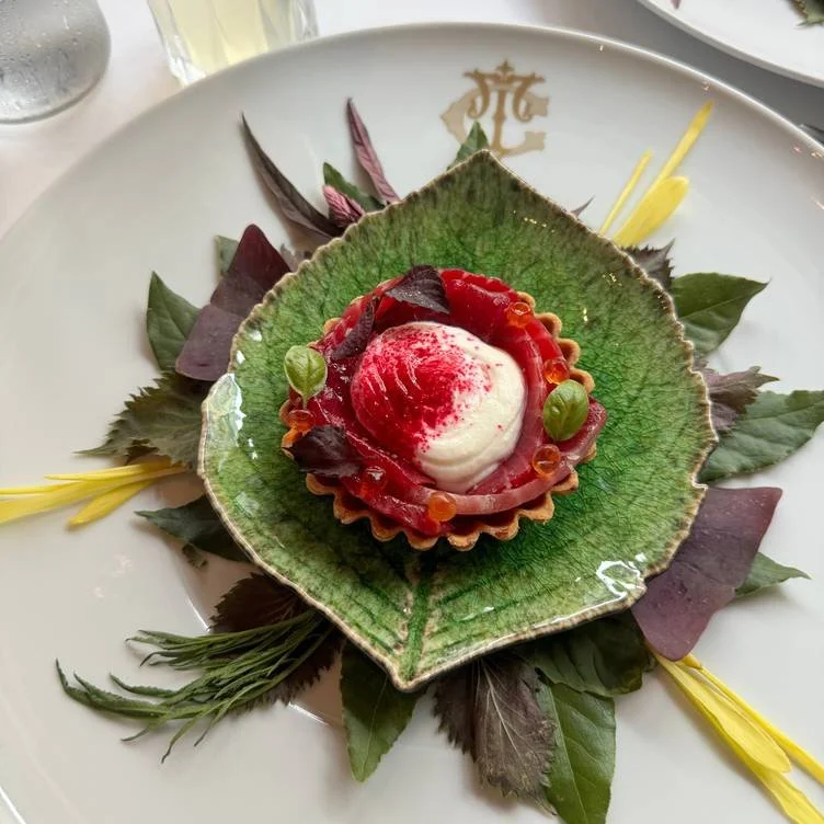 Diners enter through a sparkling Venetian glass awning to the foyer, where New Orleans artist Willie Berch’s portrait of a chef and his trusty knife towers over the space. Inside the main dining room, white plaster-adorned walls and pearlized white leather channeled banquettes are punctuated with rich, dark hues. The room, expansive in both height and length, is magnified further by antiqued mirrors, while upstairs, dinner is served to the accompaniment of a baby grand piano.